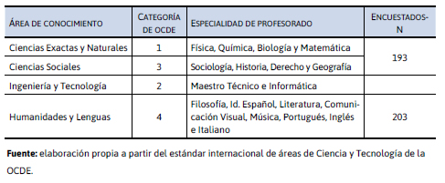 Del universo total de alumnos encuestados, 193 estudiantes integran el campo de especialidad de los profesorados de las ciencias (grupos 1 y 3 de ocde). El otro grupo de estudiantes encuestados, 203 casos, pertenecen a los profesorados agrupados en la segunda y cuarta categoría de la clasificación de la ocde.
