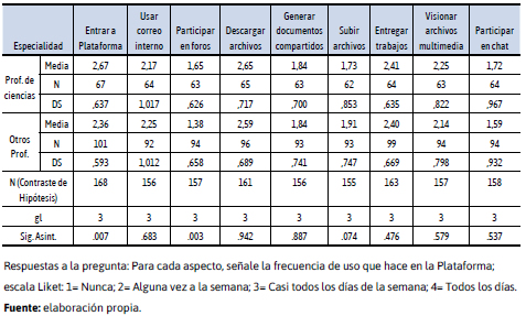 El contraste de hipótesis demostró que las diferencias entre los profesorados son significativas en dos variables: el acceso a plataforma (N=160, gl=3, p=0.007) y uso de foros (N=157, gl=3, p=0.003). En los dos casos es significativamente superior el uso en el profesorado de ciencias.