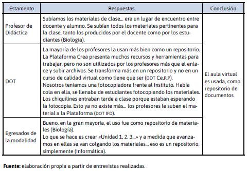 Vemos en la Tabla 2 que al ingresar a la plataforma lo que más hacen los estudiantes es descargar archivos ahí repostados. Los testimonios que surgen de las entrevistas realizadas a egresados de la modalidad presencial, profesores de Didáctica y profesores que ostentan cargos para orientar y apoyar