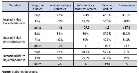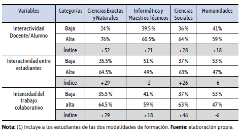 Los datos muestran un perfil de uso más activo en los profesorados de Ciencias (Exactas, Naturales y Sociales) que en el resto de las opciones de formación. Para el caso de las ciencias exactas y naturales, la interactividad docente-alumno resulta mayor que la interactividad entre estudiantes y el trabajo colaborativo. A la inversa, en las ciencias sociales, el trabajo colaborativo tiene una frecuencia elevada en una proporción de dos tercios con intensidad alta (índice + 46). Sorprende el hallazgo de una baja interactividad en disciplinas vinculadas al profesorado de informática y maestros técnicos. En los profesorados de humanidades los estudiantes tienen un bajo perfil de interacción virtual en base a las tecnologías considerando las tres variables.