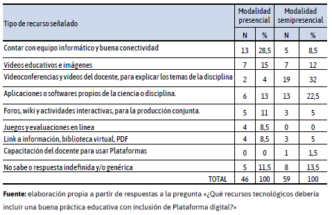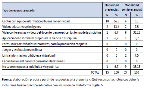 Tabla 7. Recursos tecnológicos que debería incluir una buena práctica de uso de plataforma digital según los estudiantes de los profesorados de Ciencias Exactas y Naturales