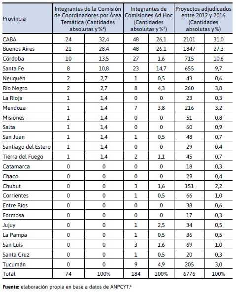 La situación respecto a la federalización se reitera en la anpcyt, aunque existe una variante en este organismo y la presencia de dos tipos de comisiones: las Comisiones de Coordinadores y las Comisiones Ad-Hoc. Del análisis puede observarse que estas últimas poseen un mayor nivel de federalización. Al analizar los datos en contexto, se obtiene que la estructura de concentración de los proyectos pict se replica en la composición de las comisiones evaluadores del foncyt. Sin embargo, también se advierten casos de provincias con muy baja participación en el sistema de evaluación a pesar de tener pict