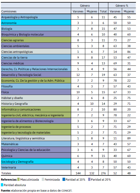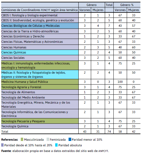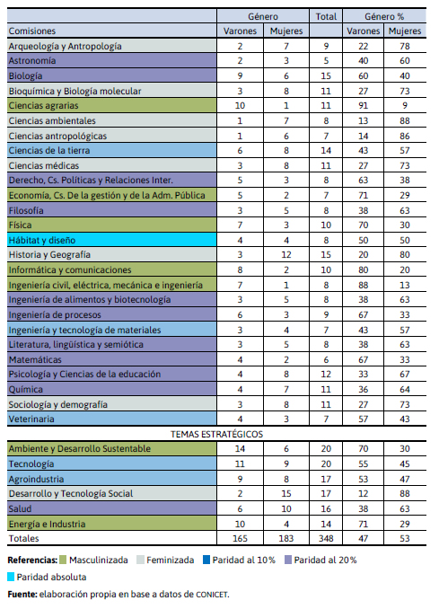 Entre las diversas expresiones de la situación de género en el sistema científico-tecnológico argentino, el análisis del universo de temas se encuentra atravesado por conceptos marco como: «disciplinas masculinizadas» vis à vis «disciplinas feminizadas». Asimismo, se estima como situaciones de «equidad/ paridad de género» hasta un porcentaje estándar entre el 60 % y el 40 % vis à vis «discriminación/no paridad», cualquier rango fuera del estándar (Estébanez, 2010). Continuando con este parámetro, pero agregándole una situación de paridad en porcentaje desde el 10 % hasta el 20 %, se analizará a continuación la composición de las comisiones de evaluación del foncyt.