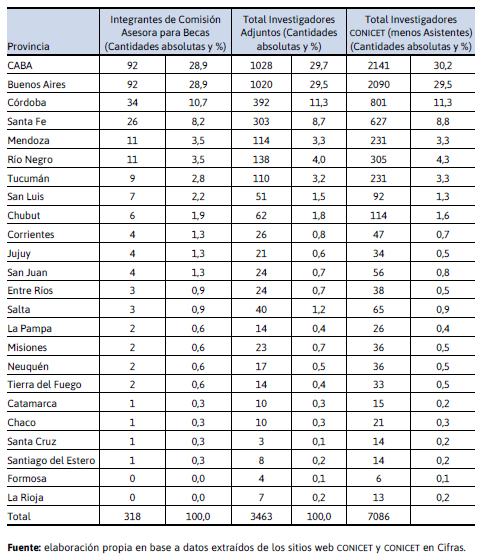 En el caso de las Comisiones Asesoras para Becas, en la Tabla 5 se observa una concentración en la región central del país compuesta por caba, Buenos Aires, Córdoba y Santa Fe, sumando en su conjunto el 76,7 % del total de miembros. Entre las restantes provincias se destacan levemente Mendoza, Río Negro y Tucumán, sumando entre ellas el 9,8 % de los miembros totales. Las demás integran la comisión con muy pocos investigadores exhibiendo una situación extrema los casos de Formosa y La Rioja con ningún miembro en la Comisión Asesora para Becas de conicet.