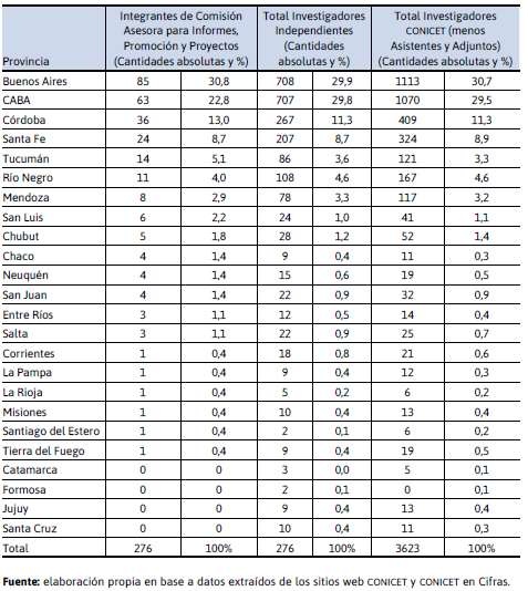 Luego de la descripción hecha en el párrafo anterior, se afirma que la distribución de miembros en las Comisiones Asesoras para Informes, Promociones y Proyectos de conicet según la provincia de lugar de trabajo se corresponde con la cantidad de investigadores de conicet en dichas provincias que reúnen los requisitos para ser elegidos integrantes de las mismas. Concretamente, el porcentaje que representa cada provincia en el total de miembros de la comisión se traslada con una diferencia aproximada de un +/- 2 % del total de investigadores Independientes o totales –excepto Asistentes y Adjuntos– que trabajan en cada provincia. La excepción es caba, ya que si bien representa un 29,8 % de investigadores Independientes y un 29,5 % de investigadores de conicet –salvo Asistentes y Adjuntos– posee un 22,8 % de miembros en las Comisiones Asesoras para Informes, Promociones y Proyectos, es decir, se encuentra sub-representada.