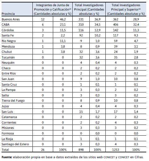 Entre los requisitos para integrar la Junta se estipula que estará conformada por investigadores destacados en sus respectivas disciplinas, de categoría equivalente o superior a la Clase Investigador Principal. De allí que con el propósito de interpretar la estructura de la Junta en relación a la distribución de los investigadores Principales en el país, se han agregado dos columnas: una con el total de investigadores Principales y otra con el total de investigadores Principales y Superiores. En base a ellas puede verse que no hay una correspondencia entre la cantidad de miembros según provincia y la cantidad de investigadores que cumplen con los requisitos para ser seleccionados. En el caso de la Junta, se suma la necesidad de contar con integrantes de las más diversas áreas disciplinares, con lo cual al ser pocos miembros el alcance de la federalización en la composición se torna más complejo de valorar. De este modo, queda demostrado que la razón por la cual la mayoría de las provincias quedan excluidas no reside en la falta de investigadores que reúnan los requisitos, sino que la decisión involucra otros asuntos.