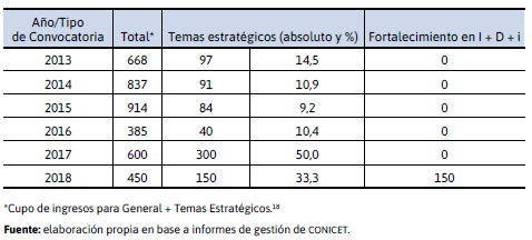 comienzos de 2013 y continúa hasta la actualidad. Como puede verse en la Tabla 10, entre 2013 y 2015 el cupo para Temas Estratégicos se mantuvo sin alteraciones bruscas, mientras que para temas generales aumentó levemente. No obstante, el primer punto de inflexión ocurrió en 2016, cuando tanto el número de ingresos en Temas Estratégicos como en temas generales se redujo a menos de la mitad. El segundo cambio en la política de ingresos a la cic fue en 2017 cuando se estableció el mismo número de ingresos tanto para Temas Estratégicos como para temas generales. La tercera y última modificación se dio en 2018 cuando la convocatoria a ingresos a las cic se desdobló en tres variantes: General, Temas Estratégicos y Fortalecimiento de Investigación, Desarrollo e innovación (I+D+i) con 150 cargos en cada categoría.
