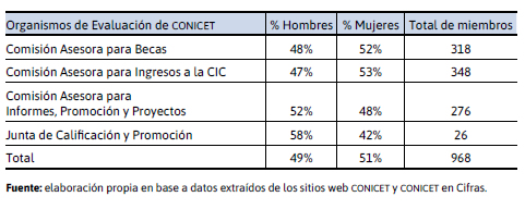 Entre los organismos de evaluación del sistema de conicet puede observarse una relativa paridad de género. Mientras en la Comisión para Becas e Ingresos existe una paridad a favor de las mujeres, en la Comisión Asesora para Informes, Promociones y Proyectos, y en la Junta de Calificación y Promoción se exhibe una paridad a favor de los hombres.