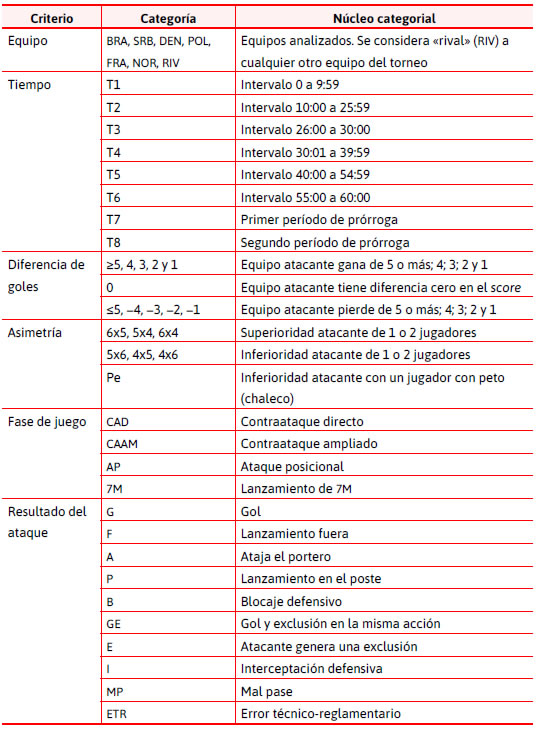 En una segunda etapa de la construcción del instrumento se procedió a definir las categorías a partir de los registros bibliográficos, siendo más específicos en la determinación de indicadores de conductas registrables vinculadas a los objetivos del estudio. En el caso del trabajo de Trejo y Planas (2018), se consideraron como criterios de búsqueda los artículos vinculados al handball y la utilización de instrumentos obervacionales (Botejara, Puñales, González, Ruy López y Trejo, 2012; Cabrera y González, 2015; González, Botejara, Puñales, Trejo y Ruy López, 2013; Lozano y Camerino, 2012; Montoya, Moras y Anguera, 2013). Conjuntamente se realizó la observación de seis partidos de handball de nivel elite del Mundial Femenino de Serbia 2013, lo que permitió ajustar el instrumento con una primera lista de criterios y categorías.