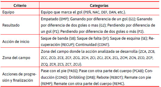 Por otro lado, en el caso de basarse total o parcialmente en un instrumento ya utilizado en estudios previos, esta primera parte del proceso de validación se reduce a determinar la lista definitiva de sistemas de categorías ya utilizados y adaptarlos al nuevo contexto. A modo de ejemplo se presenta un extracto del instrumento usado por De Pablo y González (2019) y De Pablo, Trejo y González (2019) para el estudio de las finalizaciones del ataque en el fútbol basado en zasof (Vivés, 2012) (Tabla 4).