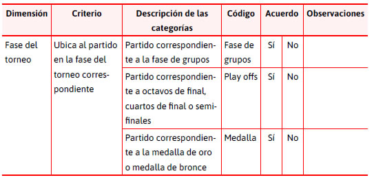 A cada experto encuestado se le alienta a realizar las observaciones que crean pertinentes para cada categoría. Incluso estando de acuerdo con una categoría, puede recomendar revisar o mejorar determinado aspecto de la misma. A modo de ejemplo, algunos de los entrenadores consultados estuvieron de acuerdo con las tres categorías presentes en la Tabla 4, pero sugirieron unir los partidos de Play off y de medalla en una única categoría, pues en los hechos eran partidos eliminatorios del torneo y deben tener un ganador, a diferencia de la fase de grupos donde un juego puede terminar en empate.
