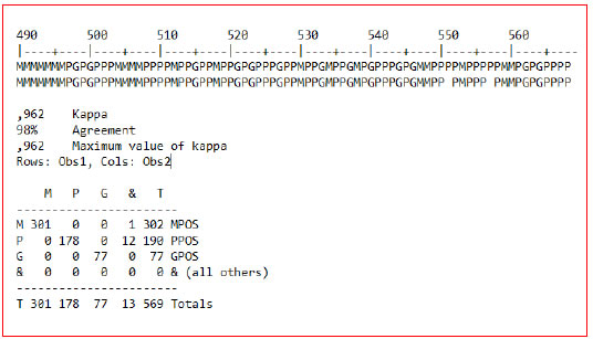 Por otra parte, desde la perspectiva cuantitativa se pueden calcular los coeficientes de concordancia interobservadores e intraobservador que indican el nivel de acuerdo. Aunque se han definido muchos índices, como el coeficiente de concordancia total, porcentaje de concordancia en ocurrencias y no ocurrencias, etc., lo más habitual ha sido la utilización del índice de Kappa (Cohen, 1960). Su interés radica en que este índice calcula la concordancia entre observadores corrigiendo las posibilidades de acuerdo debidas al azar. Por esta razón, es preferible a los porcentajes de acuerdo simples (Bakeman y Gottman, 1989). Teniendo en cuenta que el valor máximo de 1,00 representa el acuerdo perfecto, Landis y Koch (1977) proponen una escala donde valores superiores a 0,61 son considerados como buenos, y a 0,81 como muy buenos.