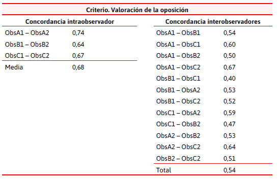 En Cabrera y González (2015), durante la elaboración del instrumento de observación ad hoc, el criterio de «valoración de la oposición» fue ajustado en repetidas ocasiones de cara a poder alcanzar buenos niveles de concordancia intraobservador e interobservadores. Finalmente, este criterio fue descartado puesto que no se alcanzó el mínimo de 0,60 que consideramos como aceptable (Tabla 6).