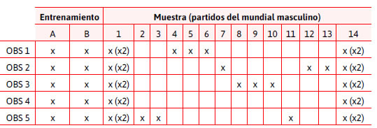 Una vez finalizado el proceso de entrenamiento es aconsejable realizar una primera sesión de observación con la muestra de investigación donde participen los diferentes observadores. Aquí, todos ellos registran la misma sesión inicial por separado y en dos ocasiones distintas. Además de medir la fiabilidad de la toma de datos, se garantiza la adecuación de los observadores al proceso específico. Posteriormente, el resto de sesiones serán registradas por un único observador o grupo de observadores entrenados. En algunas ocasiones, cuando la toma de datos se extiende, se debe verificar que no se produzca un deterioro de la fiabilidad y que la codificación de cada observador sea consistente a lo largo del tiempo (Bakeman y Gottman, 1989). Este fue el caso de los trabajos de análisis de las finalizaciones en handball de Botejara et al. (2012) y González et al. (2013), donde se analizaron los partidos con resultados ajustados; y Cabrera y González (2015), que describieron las competiciones panamericanas. Como se puede ver en la Tabla 8, en el proyecto de investigación «Estudio de las pérdidas de balón en los resultados finales de partidos igualados de handball masculino y femenino» de Botejara et al. (2011) se utilizaron dos partidos que no formaban parte de la muestra para el entrenamiento de los observadores (a y b). Posteriormente, se repartieron las observaciones, con un partido inicial (1), al comienzo de la toma de datos, que todos los observadores registraron en dos ocasiones y sirvió para determinar la concordancia intraobservador e interobservadores. Avanzado el proceso, un partido final (14) verificó el mantenimiento de la fiabilidad de los observadores. En este caso, además, el proceso de registro continuó con otras competiciones.