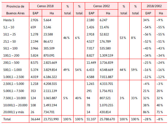 En el marco de las evidencias presentadas en las distintas regiones de la provincia, cabe apuntar que los fenómenos más recientes se registraron bajo proceso de concentración de la tenencia de la tierra, profundizando tendencias ya anotadas desde la década del 90 (Basualdo, 2008). La extensión de las grandes haciendas, las diversas modalidades de propiedad común (sociedades anónimas, fideicomisos, fondos comunes de inversión) y el creciente uso de una tecnología extensiva ratificaron tanto la adquisición como el arrendamiento de tierras por parte de grandes propietarios en el siglo xxi. Este proceso se verificó en los resultados del Censo Nacional Agropecuario 2018, donde: