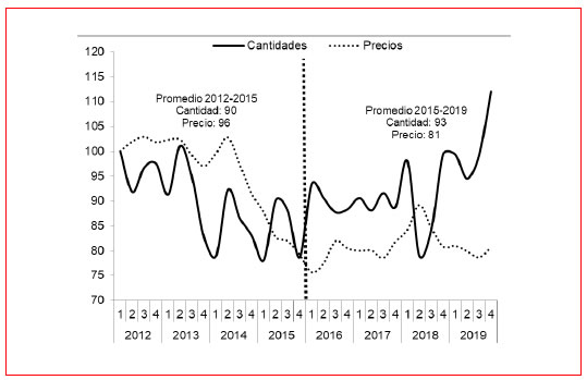 Una primera aproximación respecto de la evolución de las exportaciones a nivel nacional en 2016-2019 indica que las mismas no mostraron, en cantidades, incrementos sustanciales en relación con la etapa 2012-2015. Se anotó una desmejora de los precios (en promedio, resultaron un 16 % inferiores a los del último gobierno de Cristina Fernández), pero las cantidades registraron valores prácticamente idénticos (con una media de apenas un 1,5 % superior). Sin duda, la sequía de 2018 afectó este comportamiento, pues en 2019 las cantidades aumentaron significativamente.