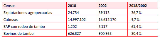 Adicionalmente, se advierte que las explotaciones agropecuarias con bovinos cayeron en más de un tercio (36,7 %) y aquellas que tienen hembras en tambo lo hicieron en prácticamente dos tercios (61,4 %) entre ambos censos. Sin embargo, la reducción de los bovinos en tambo fue menor (30,4 %), en lo que mostraría un proceso de concentración de unidades productivas con mayor rodeo y engorde a corral. En este escenario, signado por un proceso de deterioro del sector lácteo bajo la competencia contra las otras alternativas por el uso del suelo registrado desde los años 200012, se vio particularmente afectado en 2015-2019 por la mencionada caída del consumo y el aumento de los costos de los insumos (tecnología, energía, forraje) de esta etapa, que reforzaron la concentración en los tambos que producen más de 2.000 lt/día (OCLA, 2020; Rodríguez, 2018).
