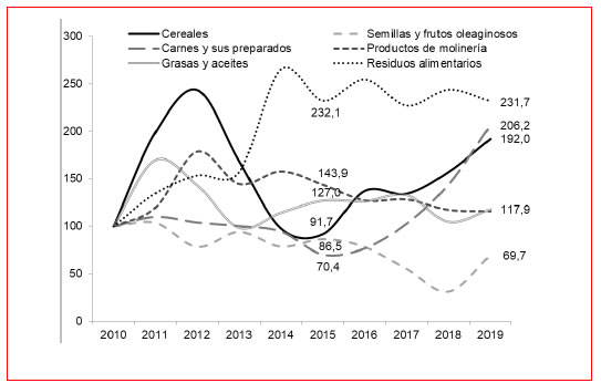 A pesar de lo anterior, una apertura más detallada de las exportaciones provinciales, concentrada en los seis rubros que explicaron entre el 53 % y el 63 % de las exportaciones de MOA y PP en los últimos diez años, indica que hubo dos sectores que dieron un giro relevante a partir de las mencionadas políticas entre 2015 y 2019: carnes y sus preparados, y cereales (especialmente trigo y maíz). En el caso de la carne, el cambio es sustancial porque sufría un declive al menos desde 2010, mientras que en cereales, se inició una recuperación que llevó los valores a niveles comparables con los de 2013. Ahora bien, en el caso del resto de los rubros seleccionados, el rendimiento ha sido mucho menos auspicioso, con un detalle singular: la molienda y los aceites, rubros de mayor incorporación de valor agregado, mostraron tendencias declinantes en relación con 2015. Ese desempeño se explica, en parte, por la escasa política de segmentación por agregación de valor implementada entre 2015 y 2019, que favoreció las producciones primarias (Rodríguez, 2018). Asimismo, semillas y frutos oleaginosos y residuos alimentarios tampoco tuvieron un mejor desempeño que en el período 2012-2015.