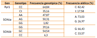 Se caracterizó la población en estudio de acuerdo a las frecuencias alélicas y genotípicas para los genes Halotano y SOX6. En la Tabla 2, se representan las frecuencias observadas para las 294 muestras porcinas analizadas. Para el gen Ryr1, el alelo normal C se encuentra representado por el 82,42 % y el alelo mutado t, relacionado con carnes PSE, por el 17.58 % siendo las frecuencias genotípicas 64,84 % para cc y 35,16 % para el genotipo Ct. Aunque no se han detectado animales con el genotipo tt, la incidencia del alelo perjudicial se evidencia en heterocigosis. Estos datos demuestran una menor frecuencia del alelo t con respecto a los resultados observados por el grupo de Marini y colaboradores (2012) (cc 65 %, Ct 30,8 % y tt 4,2 %) en poblaciones de animales híbridos en provincias mediterráneas (Córdoba, Santa Fe, Chaco y Tucumán) y aún menor a las observadas en granjas comerciales del sur de Brasil (Bastos et al., 2000; Oliveira Vargas et al., 2002; Band et al., 2005, Silveira et al., 2011). Dado que en el presente trabajo no se discrimina el origen genético de los animales (criollos o líneas híbridas comerciales) es destacable la baja frecuencia del alelo t en la población analizada. Para el gen SOX6 se estudiaron dos SNPs SOX6a (a/g) y SOX6b (c/g), para el polimorfismo SOX6a se observaron las siguientes frecuencias genotípicas: AA 47,87 %, AG 50,31 % y gg 1,82 %, que evidencian una alta frecuencia del alelo A, siendo ésta mayor a la reportada en 2015 (17, 47 y 35 % para Pietrain 36, 48 y 19 % para DuPi); mientras que para el polimorfismo SOX6b se observa una elevada frecuencia del alelo G distribuyéndose en los siguiente genotipos: gg 39,16 %, gc 54,54 %.; y si bien el genotipo cc no fue observado por Zhang y colaboradores (2015), en esta población del noreste entrerriano se encuentra representado en un 6,3 %. Estos resultados constituyen un segundo acercamiento a un análisis poblacional de los polimorfismos asociados al factor de transcripción SOX6 luego del trabajo publicado por Zhang y colaboradores (2015).