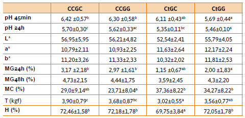 Por otro lado, se encuentran diferencias significativas (p < 0,05) entre los valores medios de humedad (h) para los diferentes genotipos observados. ccaa presenta las mayores mediciones para humedad en carne fresca que se corresponden con el elevado pH observado a los 45 minutos post mortem. Todos los genotipos resultaron en valores similares para los parámetros de color L*, a* y b* por lo que este SNP no estaría relacionado a este atributo.