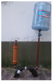 Para la potabilización de agua con contaminación microbiológica, se recomendó hervir la misma 3 minutos14 o bien el agregado de 2 gotas/L de lavandina (de 5,5 g/L), dejando actuar por lo menos media hora. Paralelamente se probó un prototipo de potabilizador de agua, diseñado por el equipo de trabajo del Programa Ambiental de Extensión Universitaria de la Universidad Nacional de La Plata (Cano et al., 2012). Dicho dispositivo genera suficiente agua potable para suplir las necesidades de una familia tipo en forma práctica y poco onerosa (Figura 3).