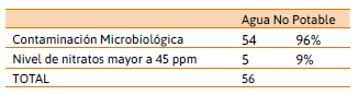 Los resultados mostraron la extensión del problema: el 96% de las muestras de agua (provenientes de 54 quintas) resultaron microbiológicamente No Potables. Y más aún, cinco de esas muestras (9% del total) eran a su vez No Potables por exceso de nitratos (Tabla 1).