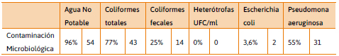 De las muestras con contaminación microbiológica, 43 análisis (77 %) devolvieron como resultado más de 3 nmp/100ml de coliformes totales, con un promedio de casi 25 nmp y mediana de 23 nmp. Paralelamente, en 14 análisis (25 %) se detectaron coliformes fecales, 2 de ellos con presencia de E coli. Asimismo, se determinó la presencia de P. aeruginosa en 31 muestras (55 %) (Tabla 2).
