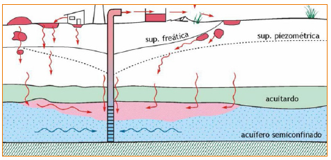 - En los acuíferos3, por la migración descendente de contaminantes desde la superficie o las napas y posibilitado por perforaciones antiguas, en mal estado de conservación, con deficiente o directamente sin aislamiento o bien potenciado por la disminución del potencial hidráulico.