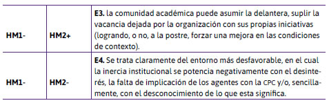 HM2. Un posicionamiento informado, interesado y proactivo de los integrantes de la comunidad académica contribuye a fortalecer y sostener las estrategias y acciones institucionales –o a reemplazarlas, llegado el caso– (HM2+), mientras que un posicionamiento neutral, frágil y/o poco consistente produce el efecto inverso (HM2-).