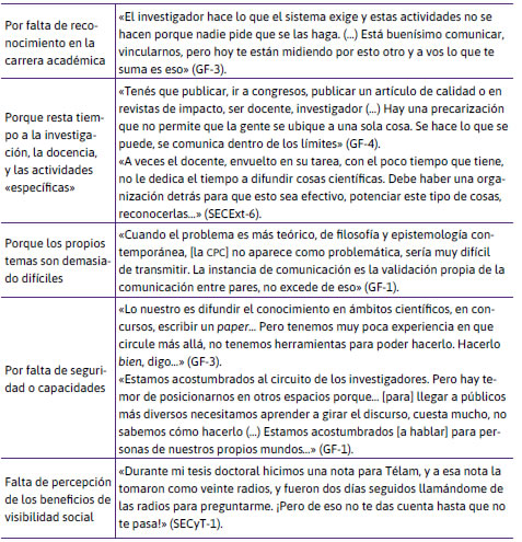 Estudios realizados durante décadas en distintos contextos han demostrado que los científicos/as enfrentan serias dificultades y pocos incentivos para implicarse con la cpc (Trench y Miller, 2012; Bauer y Jensen, 2011; Kreimer, Levin y Jensen, 2011; Torres Albero, Fernández Esquinas, Rey Rocha y Martín Sempere, 2011; Davies, 2008; Poliakoff y Webb, 2007; Gascoigne y Metcalfe, 1997; Pearson, Pringle y Thomas, 1997). Las razones tienden a coincidir: la comunicación con los medios y el público no se percibe como inherente a sus funciones y obligaciones sino como una imposición externa que resta tiempo a sus prácticas específicas. Tampoco se advierten los beneficios que ello reportaría y se recela de la exposición a las reacciones de los pares. Asimismo, dudan de que los medios puedan reflejar de manera «apropiada» la complejidad de su producción o área disciplinar. Finalmente, la escasa o nula valoración de las prácticas divulgativas en el sistema de reconocimientos de la carrera académica, la sensación de no estar capacitados para desempeñar esas actividades y el temor a enfrentar situaciones adversas son otros de los obstáculos más severos que desalientan la participación.