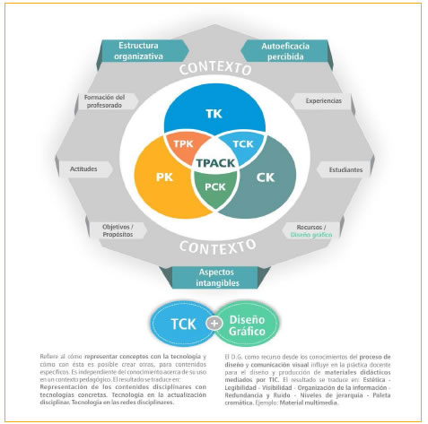 En relación con lo anterior, Angeli y Valanides (2009) y Cabero (2014) indican que el marco de saberes no puede estar abstraído del contexto que lo enmarca, las ideas acerca del aprendizaje, la estructura organizativa, la autopercepción en el uso de las tic, los elementos intangibles (cuestiones ideológicas y éticas) que subyacen al currículum y la acción del docente en el escenario concreto donde actúa.