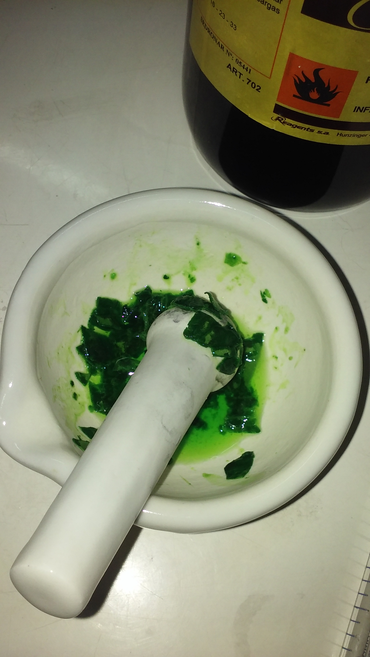 La actividad se denominó «Los pigmentos verdes y su relación con la eutrofización» y consistió en determinar un parámetro indicativo de la contaminación ambiental cuantificando la clorofila en cuerpos de agua superficiales, con la finalidad de estimar su eutrofización. La eutrofización ocurre debido al aumento de nutrientes del agua, lo que provoca que las algas crezcan en gran cantidad, causando la turbidez. Este parámetro aporta información sobre la calidad del agua y permite evaluar si es adecuada para la función en la cual se la necesita emplear. Para llevar a cabo esta actividad, se dividió la clase en dos partes: una etapa inicial en la cual se hizo una introducción y exposición de los conceptos teóricos necesarios para la comprensión de la parte experimental mediante herramientas de Power Point y folletos explicativos, y una segunda etapa en la cual se llevó a cabo la parte práctica propiamente dicha. Para ello, a una cantidad específica de hojas de espinaca se le extrajo la clorofila con acetona con la ayuda de un proceso de mortereo continuo de 10 minutos. A esa solución obtenida se le realizaron diluciones seriadas desde 1/25 a 1/2 para lograr preparar 5 muestras con diferentes concentraciones de clorofila. A estas muestras se les realizaron las lecturas espectrofotométricas (absorbancias) de los pigmentos verdes a la longitud de onda de 664 nm. El instrumento utilizado para esto fue un espectrómetro portátil Wireless Spectrometer PS 2600 marca PASCO acoplado a una laptop o celular. Las muestras presentaron distintos grados de turbidez relacionado con el contenido de clorofila correspondiente, siendo aquella muestra más turbia la que presentó mayor valor de absorbancia. A partir de estos valores de absorbancia se calcularon las concentraciones de clorofila utilizando las ecuaciones de Jeffrey y Humphrey (1975) y se determinaron dentro de qué categoría trófica (Ultraoligotrófica, Oligotrófica, Mesotrófica, Eutrófica, Hipertrófica) correspondería cada muestra (OCDE, 1982; como se cita en Ryding, et al., 1992).