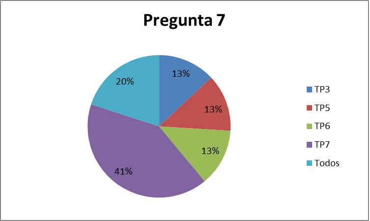 Respecto a las preguntas abiertas, la pregunta N.° 7 adaptada al contexto del dictado quedó definida de la siguiente manera: «¿Cuál de los trabajos prácticos resultó de tu interés?». En Química Analítica se dictan 7 trabajos prácticos, mientras que en Química Ambiental se desarrollan 3. En la Figura 7A y 7B se representan las respuestas brindadas por las y los estudiantes al finalizar el cursado de Química Analítica y Química Ambiental, respectivamente.