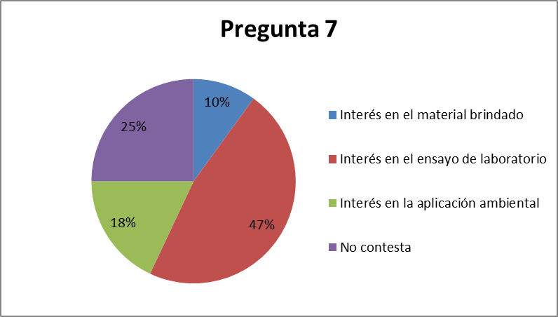 Con respecto a las respuestas abiertas correspondientes a las preguntas N.° 7 y 8, las y los alumnos del secundario pudieron expresarse libremente sin limitaciones en cuanto a las opciones. En el caso de la pregunta N.° 7 «¿Qué es lo que más te interesó de esta actividad? (Desarrollar)», las respuestas brindadas que se grafican en la Figura 3 fueron: (1) Interés en el material brindado, (2) Interés en el ensayo de laboratorio, (3) Interés en la aplicación ambiental. En este caso la opción «No contesta» ocupó un 25 % del total de respuestas, quedando en el segundo lugar con respecto a su frecuencia de selección.